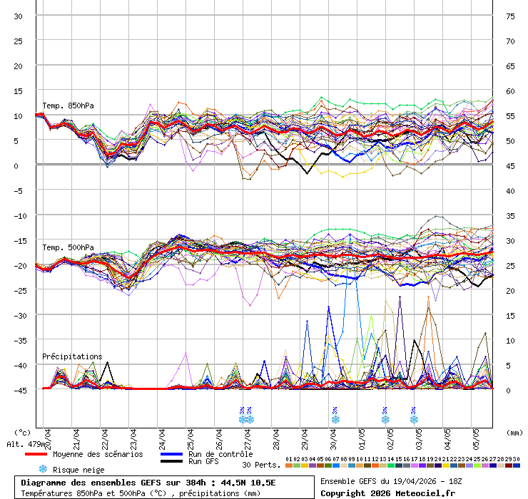 Precipitazioni e temperature a 850 hPa e 500 hPa, punto modello 10.5E 44.5E |