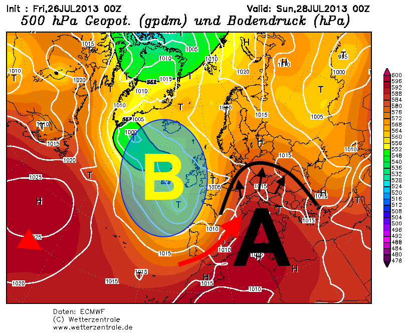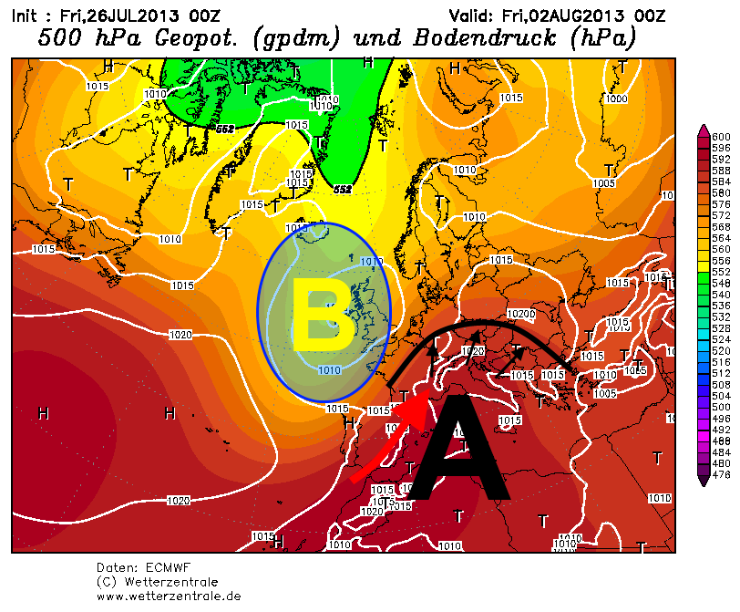 Domenica 28 luglio, ore 01.00: è ben visibile il robusto promontorio anticiclonico di matrice africana, che interessa la penisola italiana e, in misura più attenuata, il centro Europa (dati ECMWF - rielaborazione ReggioEmiliaMeteo)