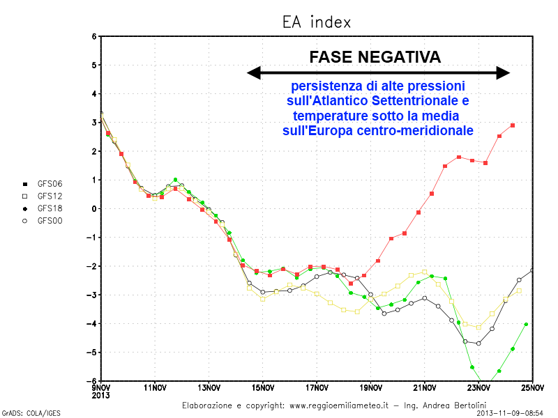 previsione dell’East Etlantic (EA) a 15 giorni, emissione del 9 novembre: deciso e prolungato calo dell’indice, con fase spiccatamente negativa tra il 14 e il 25 novembre -> probabile persistenza di alte pressioni sull’Atlantico Settentrionale e temperature sotto media sull’Europa centro-meridionale.