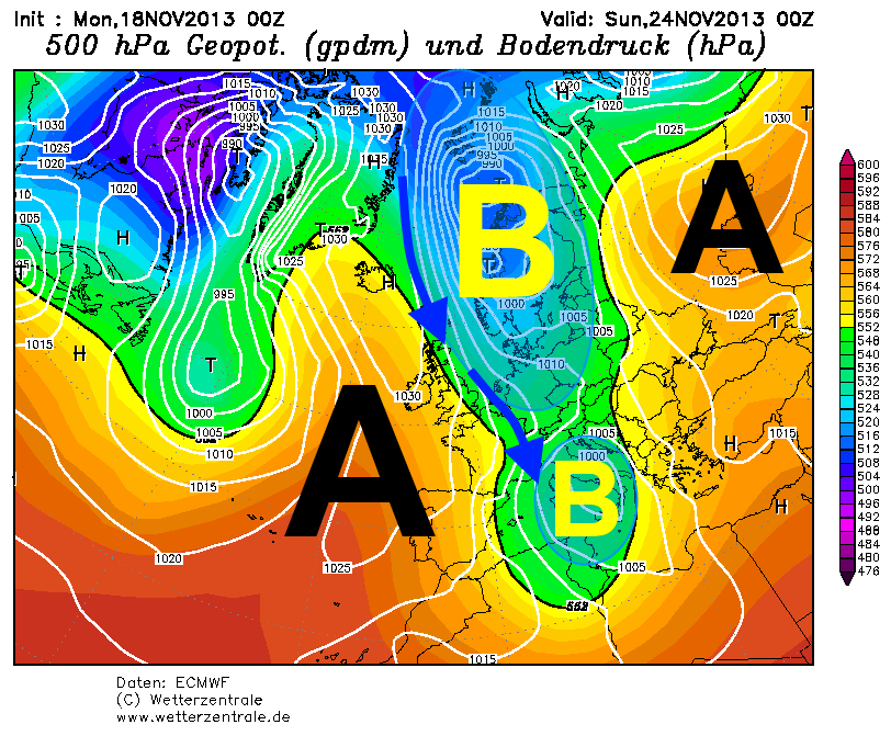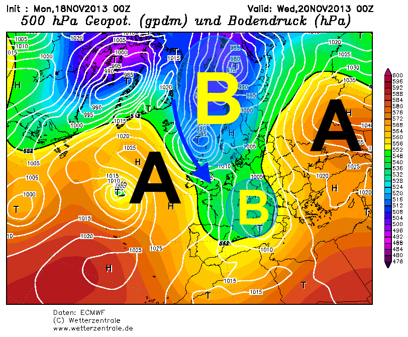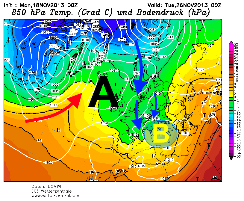 Esaminando nel dettaglio la situazione su scala Europea, si può osservare che alla risalita dall’alta pressione delle Azzorre verso le latitudini più settentrionali, risponderà una discesa di correnti polari verso la Gran Bretagna. Aria molto fredda tenterà quindi, di raggiungere il vortice depressionario presente sul Mediterraneo centrale.