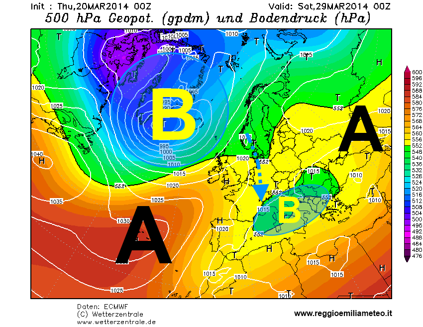 sabato 29 marzo, ore 01.00: l’area depressionaria sul Mediterraneo tende lentamente a colmarsi; residua instabilità sull’Italia (dati ECMWF - rielaborazione ReggioEmiliaMeteo).