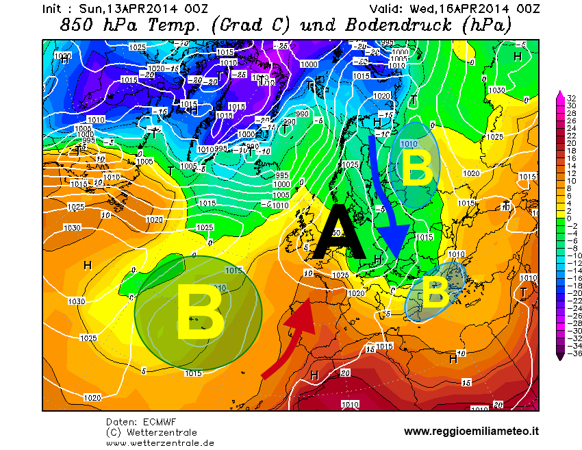 Mercoledì 16, ore 02.00: aria artica scorre lungo il bordo orientale dell’anticiclone lambendo la nostra penisola. Bassa probabilità di precipitazioni, ma temperature in sensibile calo (dati ECMWF - rielaborazione ReggioEmiliaMeteo)