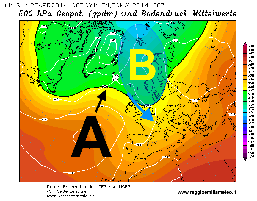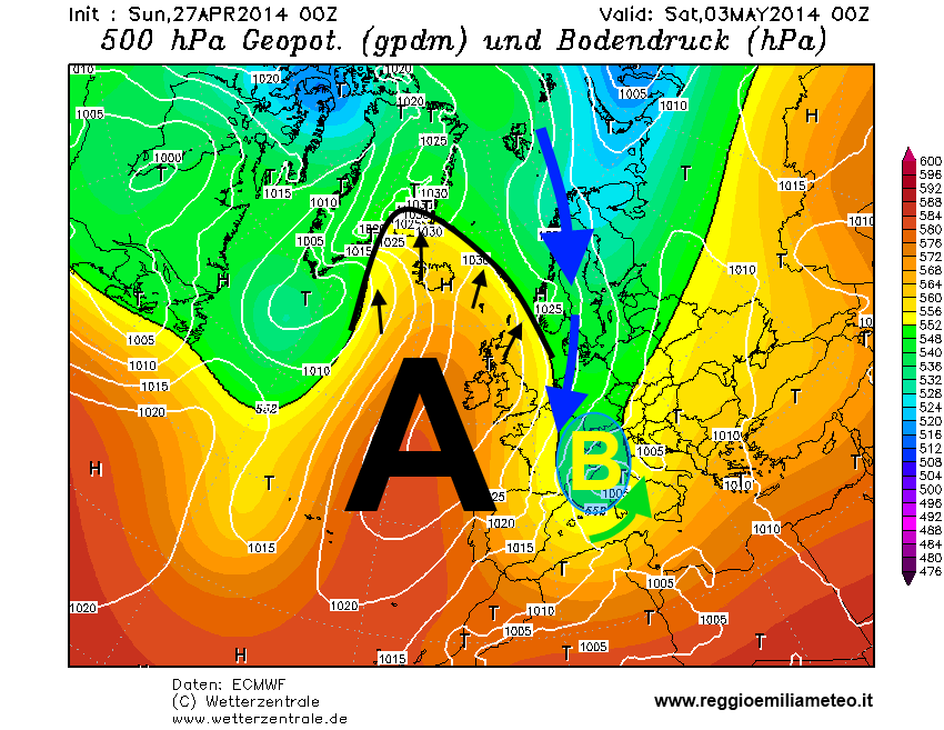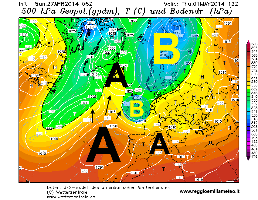 Giovedì 1 maggio, ore 14.00: mentre sul reggiano il sole torna a prevalere sulle nubi, in Atlantico un promontorio anticiclonico inizia ad espandersi verso Nord (dati GFS - rielaborazione ReggioEmiliaMeteo)