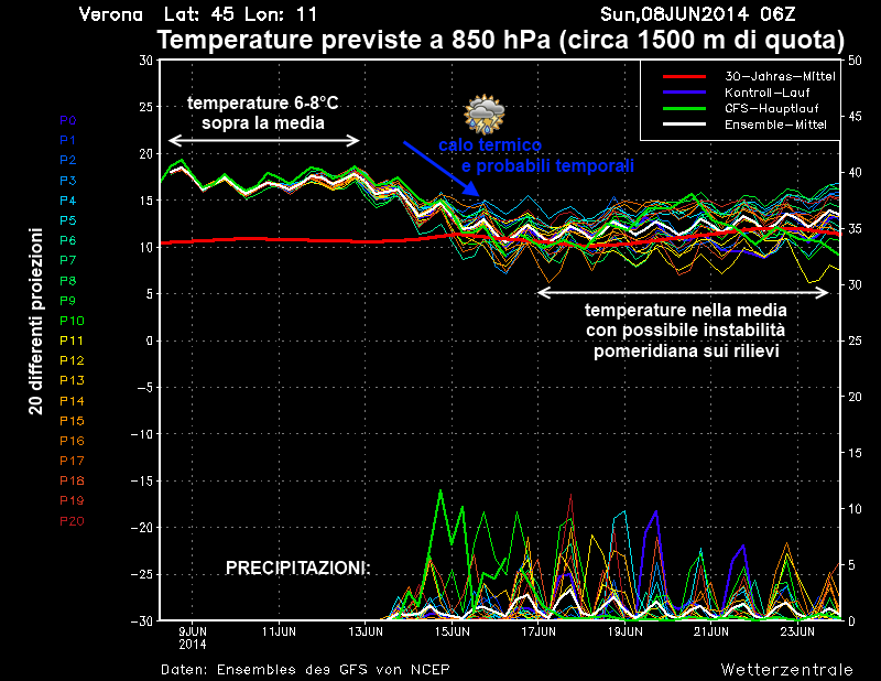 'Spaghetti' elaborati per la città di Verona, riferimento per l'Italia settentrionale (dati Ensembles su base GFS - rielaborazione ReggioEmiliaMeteo)