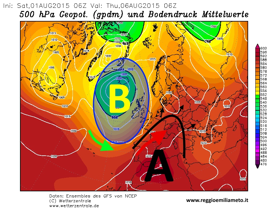 Veniamo ora a ciò che accadrà nella prima decade di agosto, quando il caldo tornerà prepotentemente a farsi sentire. Su scala europea, si ripropone una struttura barica ormai ben conosciuta: una profonda depressione sull’Atlantico settentrionale (B) e la conseguente espansione dell’anticiclone (A), che convoglierà aria molto calda dal Nord Africa all’Europa.
