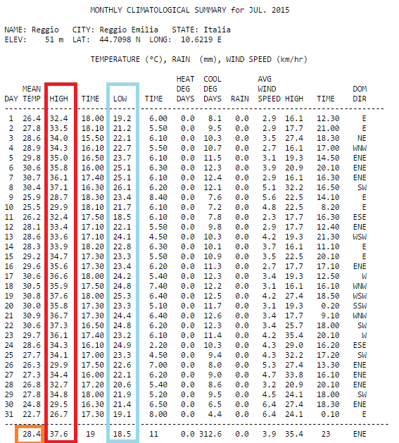 La minima del mese è stata di +18.5°C, la massima assoluta di +37.6°C. Ma a dare la misura del clima è la temperature media mensile: luglio 2015 chiude a Reggio Emilia con una temperatura media di +28.4°C. Si tratta di uno scarto significativo (ben +4.6°C) sulla media del trentennio 1961-1990, cioè sulla media dei 30 mesi di luglio passati. A Novellara, per cui manca una serie di riferimento, la media di luglio 2015 è stata addirittura di +28.8°C.