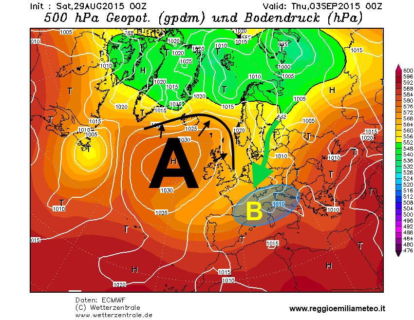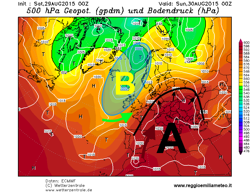 Domenica 30 agosto, ore 00.00: l'espansione di un promontorio anticiclonico di origine Nord-africana all'Europa Centrale, favorisce l'afflusso di aria decisamente calda dalle latitudini più meridionali (dati ECMWF – rielaborazione ReggioEmiliaMeteo)