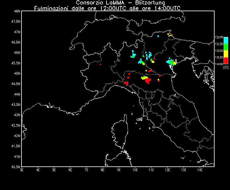 I fenomeni terminano alle 16.00 su Reggio (acumulo di 7 mm) e 30 minuti dopo su Arceto (accumulo di 10 mm e vento intenso con raffiche sino a 63 km/h).