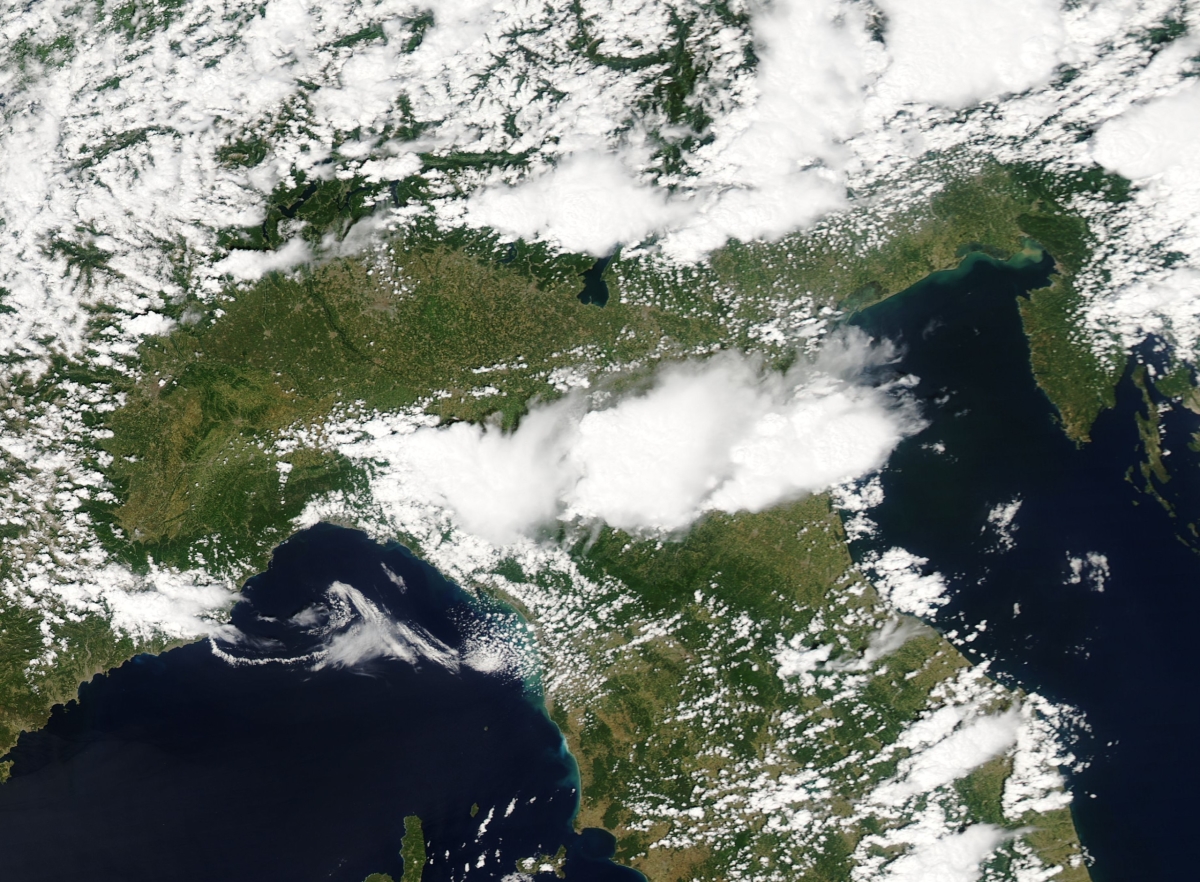 Infine uno sguardo dall'alto. L'immagine satellitare mostra come le nubi temporalesche, in moto da Ovest verso Est, interessino tutta l'Emilia: