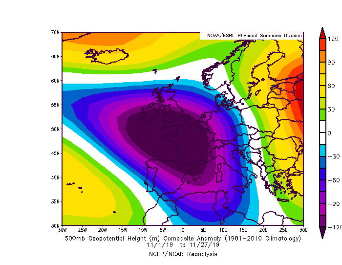 Figura 4)Intense anomalie negative di geopotenziale sull'Europa Occidentale con asse di saccatura medio in direzione del Mediterraneo. Anomalia di geopotenziali positiva con condizioni anticicloniche sull'Est Europa e alle latitudini polari.