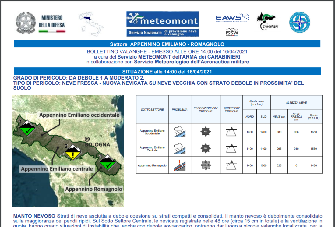 In allegato il bollettino valanghe di oggi venerdì 16 aprile (click sull'immagine) e la guida alla sua lettura.