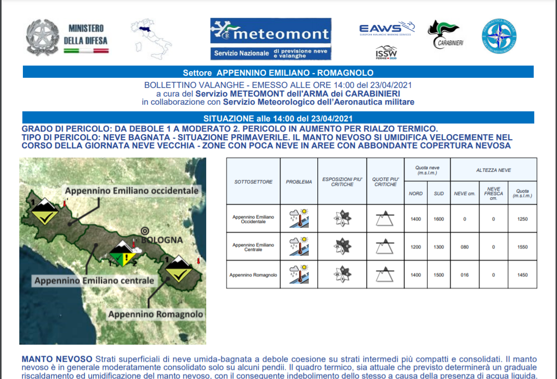 In allegato il bollettino valanghe di oggi venerdì 23 aprile (click sull'immagine) e la guida alla sua lettura.
