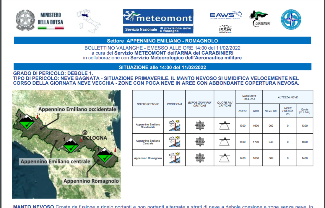 Al Rifugio Battisti posto a 1761 m. di quota e alla stazione del Monte Cusna a 2057 m., le centraline hanno rilevato negli ultimi giorni temperature attorno allo zero. La poca neve residua è relegata ai pendii esposti a nord, in modo molto disomogeneo e con caratteristiche molto differenti. La situazione si conferma, almeno fino a oggi, di tipo primaverile con neve dura e trasformata, e frequenti placche di ghiaccio.