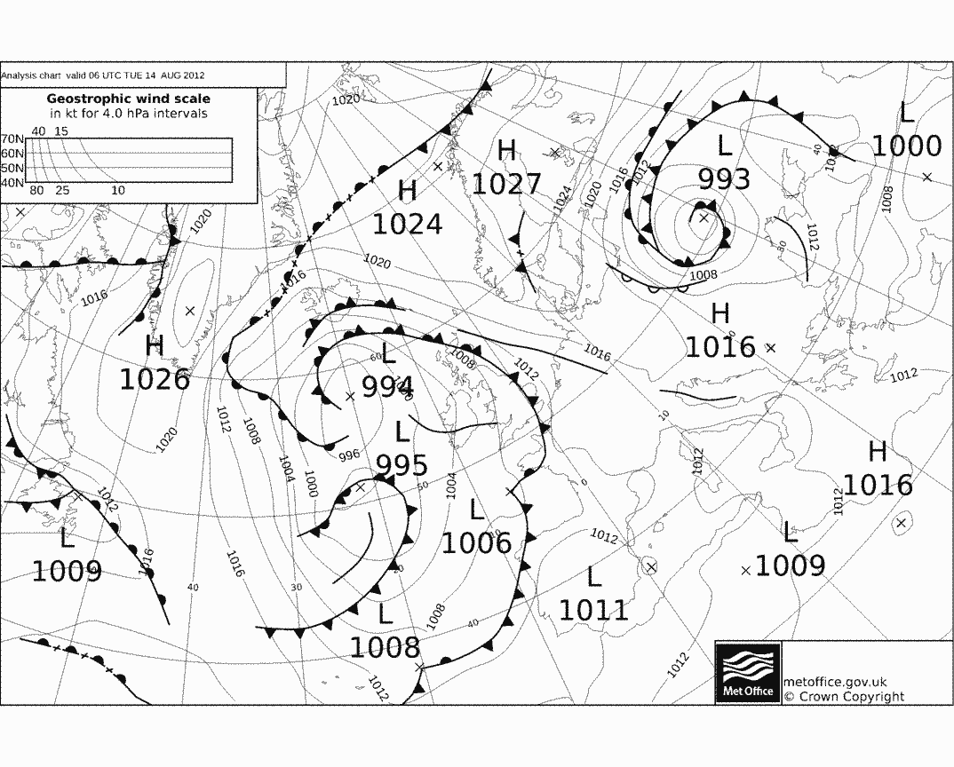 Dall'analisi sinottica relativa alla giornata odierna, martedì 14, si nota come le perturbazioni (i cui centri sono indicati con L [Low]) interessino latitudini elevate: un primo centro di bassa pressione porta maltempo fra Ucraina, Polonia e area russo-baltica, mentre un secondo sistema perturbato, denomitato Xenja dall'Università di Berlino, porta nubi e piogge su Gran Bretagna e coste atlantiche europee.