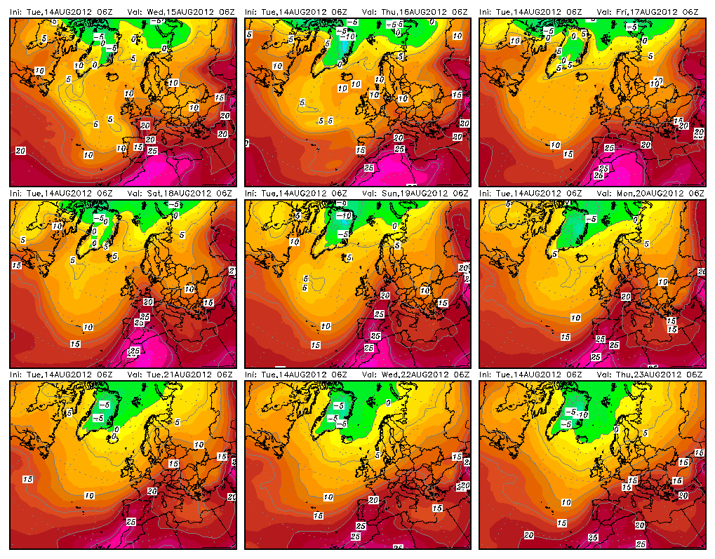 Sul Mediterraneo mancano per ora figure bariche influenti; in tal modo viene lasciata aperta la porta alla risalita di un nuovo anticiclone africano, che avanzerà lungo il margine orientale di Xenja, interessando nell'ordine Spagna, Baleari, Francia e nord Italia. La distribuzione delle anomalie di temperatura alla quota standard di 1500m evidenzia il percorso dell'ondata calda: