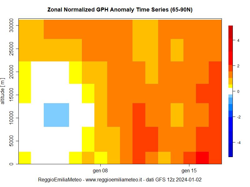 Anomalia termica, sezione verticale sopra l'area polare (65-90°N), stratwarming in corso