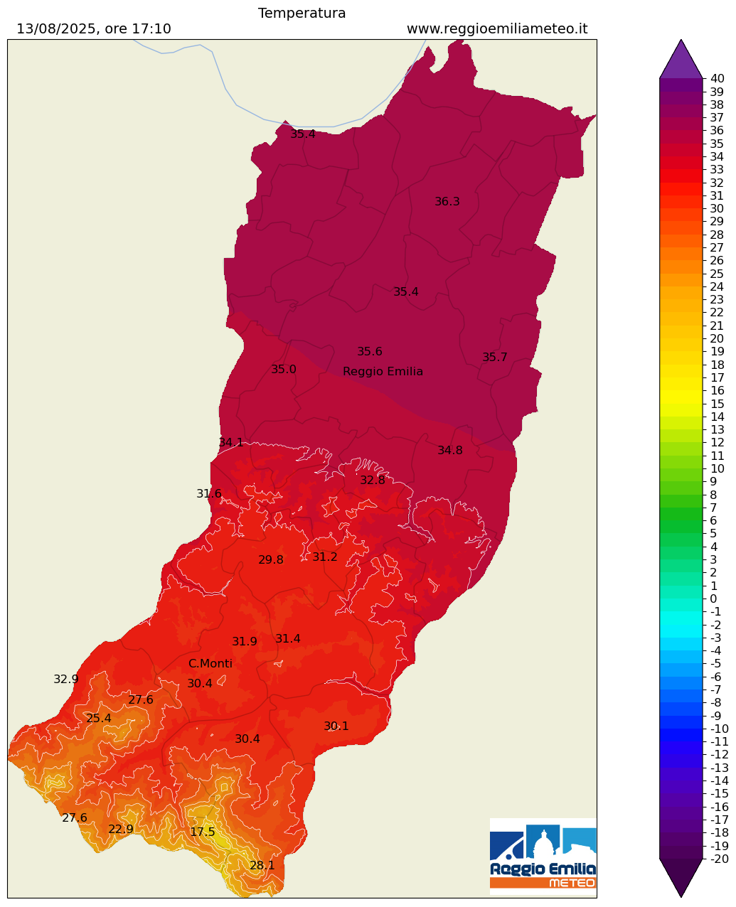 | Mappa della temperatura di oggi, mercoledì 13/08, ore 17.10- |