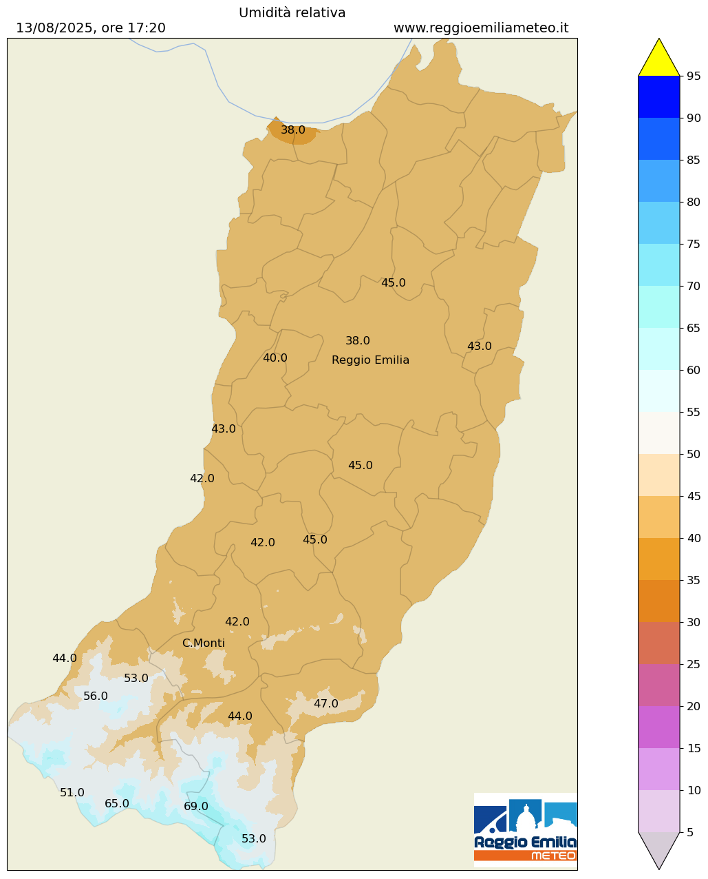 Mappa dell'umidità relativa di oggi, mercoledì 13/08, ore 17.20 |