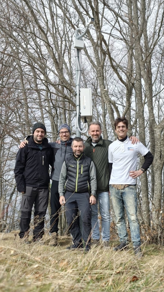 | La strumentazione installata e la squadra REM sul posto: Daniele Severi, Andrea Bertolini, Davide Camagnoni, Andrea Mattioli e Alessandro Montanarini |