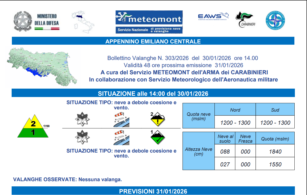 Importante: il bollettino valanghe deve essere letto tutti i gironi, prima di ogni escursione in quota. Con le condizioni previste è assolutamente necessario essere completamente consapevoli della situazione di avere un equipaggiamento completo di ramponi, piccozza, casco, oltre che del dispositivo Artva con pala e sonda.