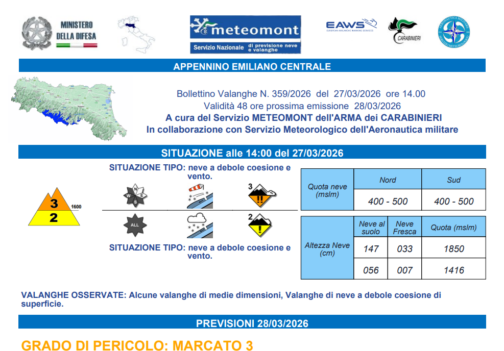 Importante: il bollettino valanghe deve essere letto tutti i giorni, prima di ogni escursione in quota. Con le condizioni previste è assolutamente necessario essere completamente consapevoli della situazione di avere un equipaggiamento completo di ramponi, piccozza, casco, oltre che del dispositivo Artva con pala e sonda.