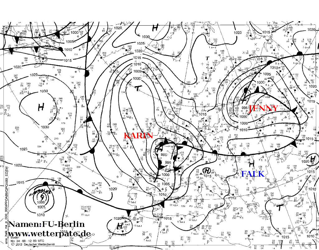 L'avanzare della stagione ha sì fatto abbassare di latitudine le umide correnti atlantiche, ma, per il momento, non in misura sufficiente da segnare un netto cambio di stagione su tutta la penisola: il blocco altopressorio sui balcani (Falk), sebbene non sia particolarmente robusto, è tuttavia abbastanza ampio da proteggere i settori più orientali dell'Italia, relegando il maltempo, effetto delle correnti meridionali pilotate dalla poderosa bassa pressione Karin, sul Nord-Ovest e sui settori prealpini in generale.