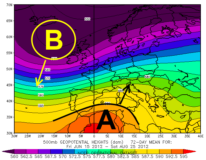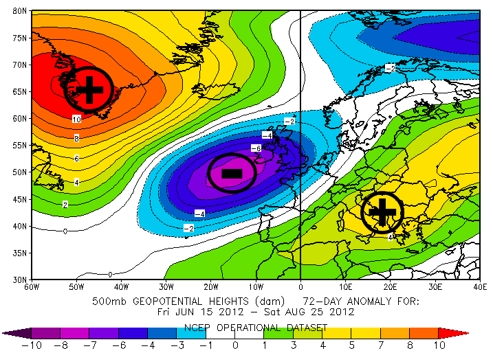 Fig.3: anomalia di altezza geopotenziale a 500hPa media tra 15 giugno e 25 agosto 2012 |