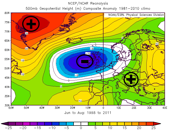 Fig.4: anomalia di altezza geopotenziale a 500hPa media trimestre estivo 1998-2011 |