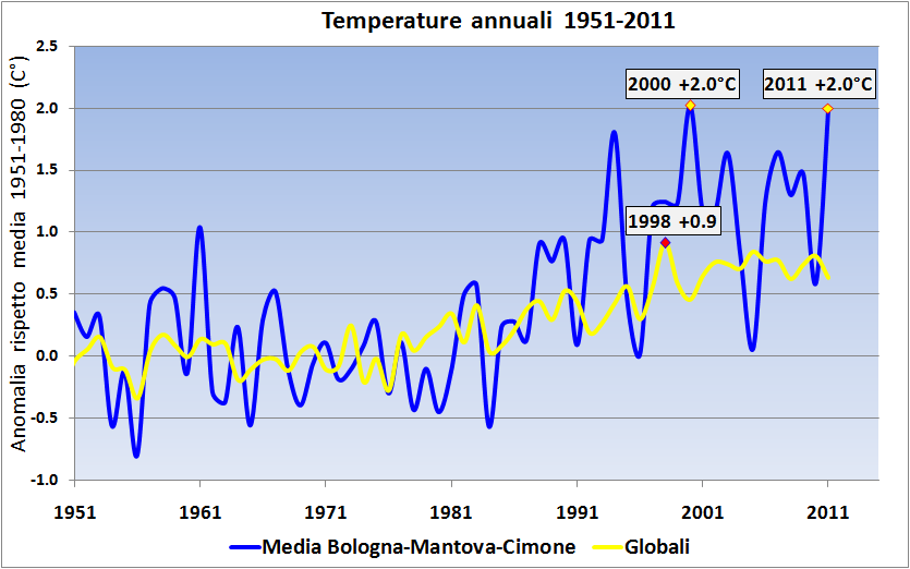 scarto dalla media 1951-1980 più forte per le temperature locali,