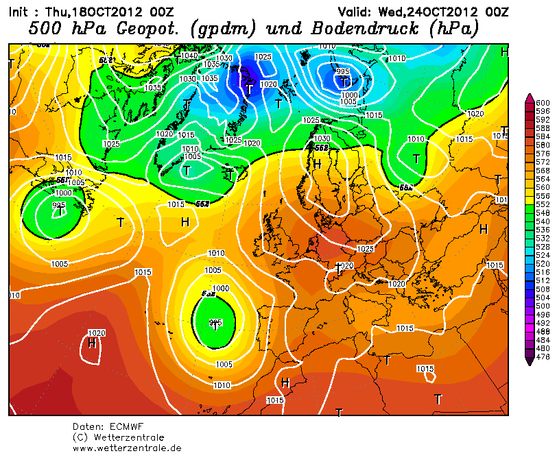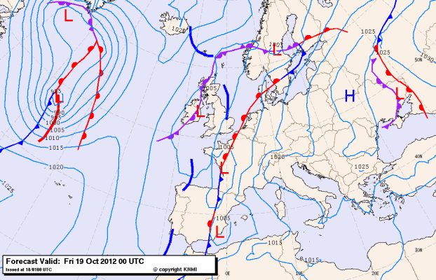 Notte tra giovedì 18 e venerdì 19 ottobre: il flusso sud-occidentale legato alla presenza della saccatura estesa dalla Gran Bretagna alla penisola iberica, porta aria calda e umida verso il Nord Italia