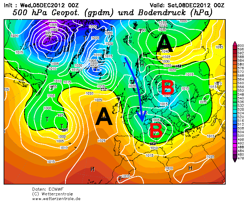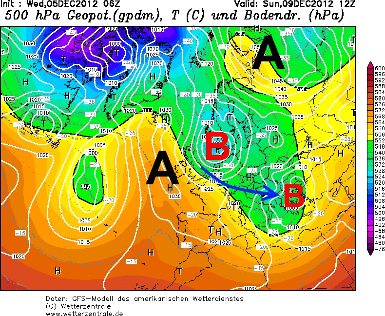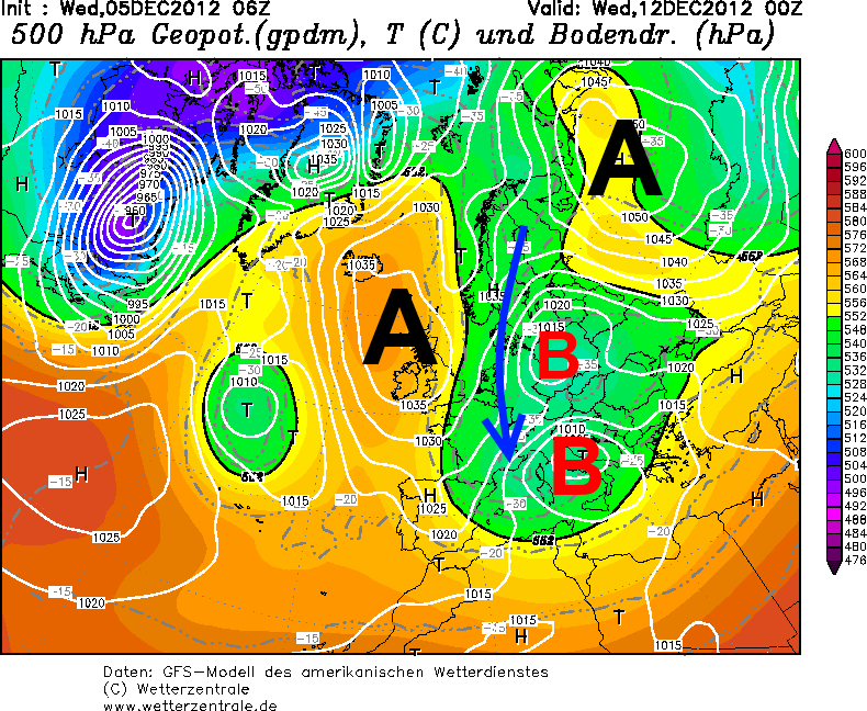 Prime ore di mercoledì 12 dicembre: alta pressione Russo-Scandinava in grande spolvero tende a saldarsi con il promontorio anticiclonico presente sul Nord Atlantico; nuovi impulsi perturbati in direzione del Mediterraneo centrale