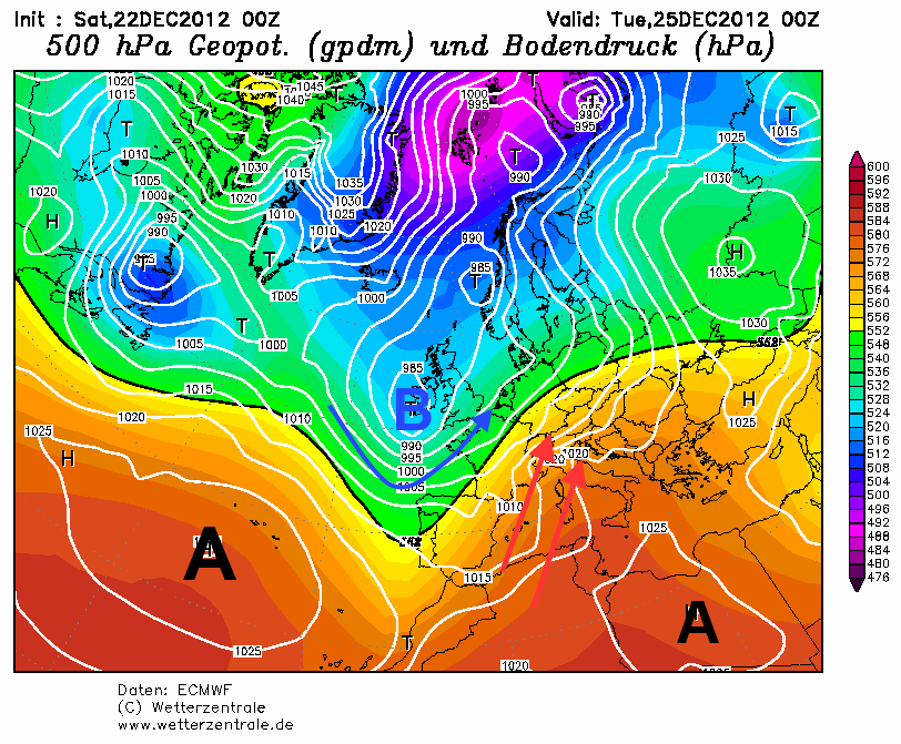L’affondo di aria relativamente fredda al largo delle coste portoghesi, pilotato dal centro di bassa pressione in prossimità dell’Irlanda (B nella mappa seguente), risulta stretto fra due ampie strutture altopressorie (A): la prima – l’anticiclone delle Azzorre -, decisamente più ampia, ha il suo massimo di 1030 hPa in pieno Oceano Atlantico, mentre la seconda, più modesta, è situata sul territorio libico.