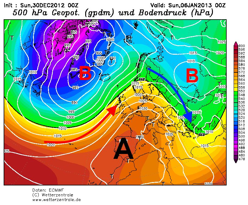 Ore 00 di domenica 6 gennaio: sinottica europea prevista (dati ECMWF - rielaborazione reggioemiliameteo.it)
