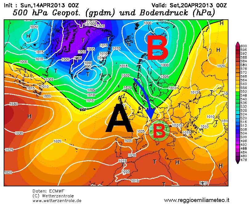 Sabato 20, ore 01.00: l'alta pressione sul Regno Unito e la discesa di aria frdda sul suo bordo orientali, con conseguente peggioramento sul nord Italia (dati ECMWF - rielaborazione ReggioEmiliaMeteo)