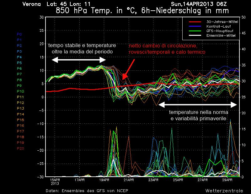 "Spaghetti" Ensambles: le tre distinte fasi individuabili nei prossimi giorni; nella parte bassa della mappa, le precipitazioni previste (dati Ensembles GFS - rielaborazione ReggioEmiliaMeteo)