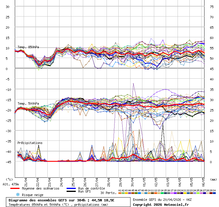 Precipitazioni e temperature a 850 hPa e 500 hPa, punto modello 10.5E 44.5E |